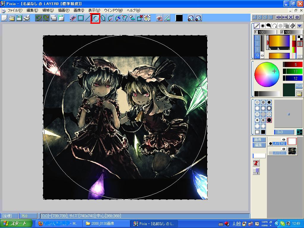 ②円形選択ツールを使用して、円形に時計にしたい範囲を選択します。