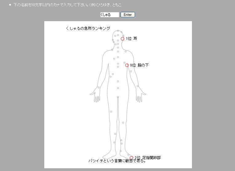 はい。まぁやってみれば分かると思いますが、自分の名前を入れてボタンを押すと、自分の急所を図にして教えてくれるそうですよ。